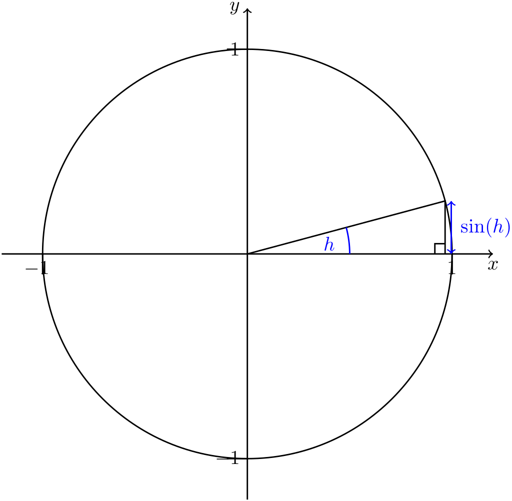 When \(h\) is small, \(\sin(h)\) becomes a better and better approximation for the arclength of the sector with angle \(h\). But since the radius is 1, arclength is equal to \(h\) radians, and hence \(\sin(h)\approx h\). For small \(h\), it follows that \(\frac{\sin(h)}{h}\approx 1\), approaching equality as \(h\rightarrow 0\).