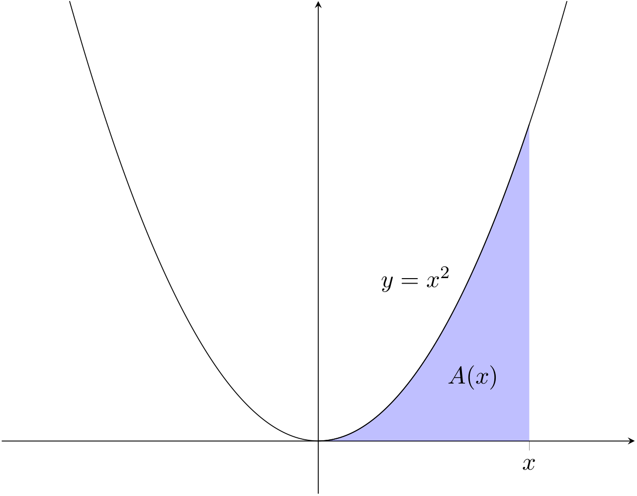Consider the function \(y = x^2\) and let \(x \geq 0\) be a typical \(x\)-coordinate. Let \(A(x)\) be the area under the curve from \(0\) up to \(x\).