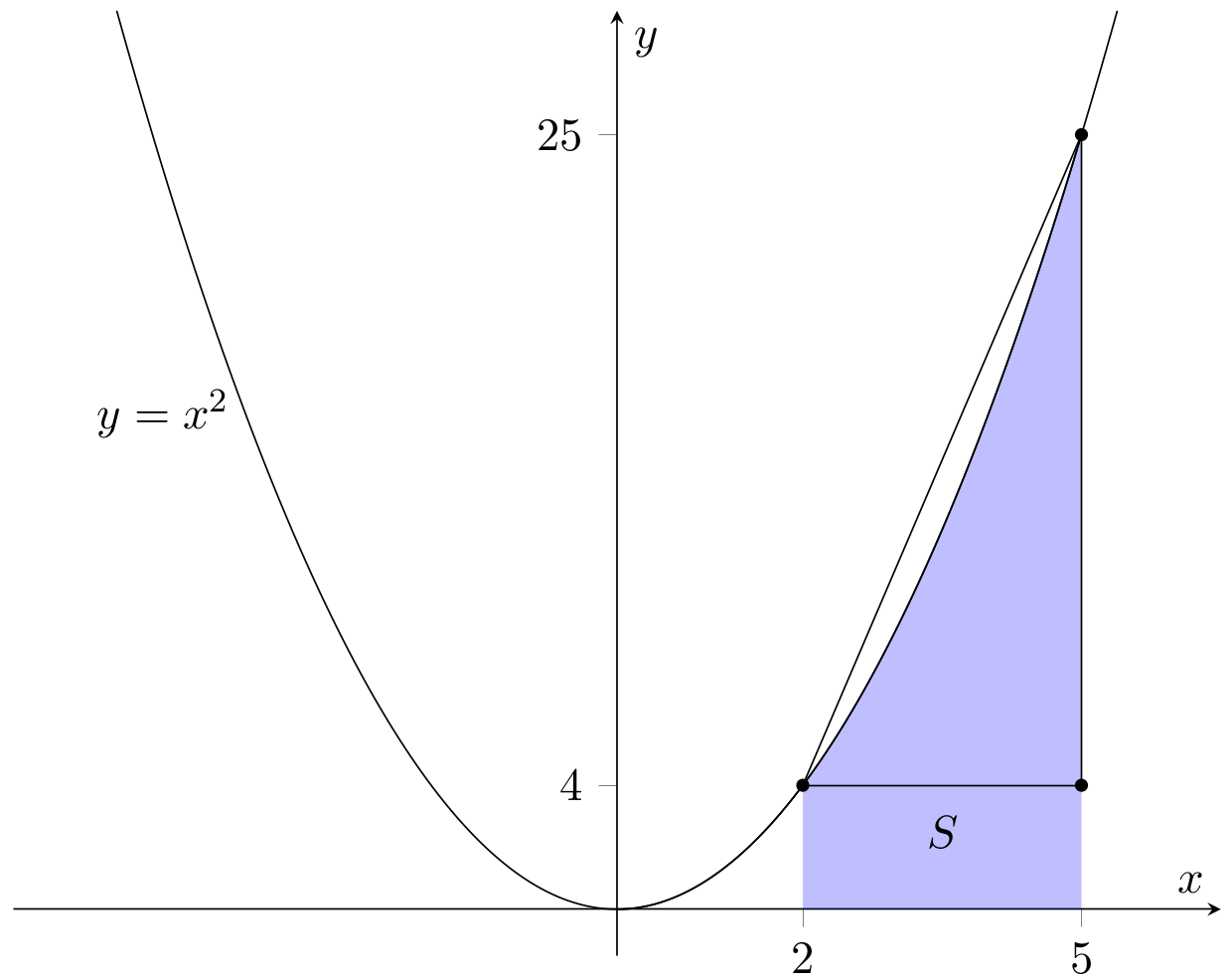 (We can check this result on a picture of \(y=x^2\): the area \(S\) consists of a rectangle of length \(3\) and height \(4\) with a “triangle” on top of it of base \(3\) and height \(5^2-2^2=21\).