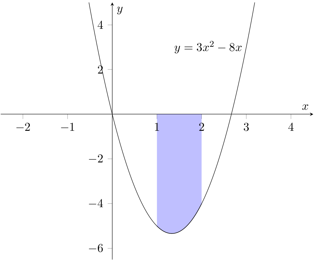 Fig. 12.5 Graph of \(y=3x^2-8x\) with shaded area between \(x=1\) and \(x=2\).#