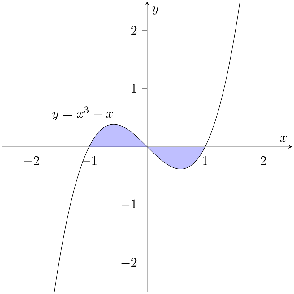 To counteract this, we split the calculation into \(\displaystyle I_1= \int_{-1}^0(x^3-x)dx\) and \(\displaystyle I_2=\int_0^1(x^3-x)dx\). Then the area between \(x=-1\) and \(x=0\) is given by \(I_1\), the are between \(x=0\) and \(x=1\) is given by \(-I_2\) (since \(I_2\) will be negative) and hence the total area is
