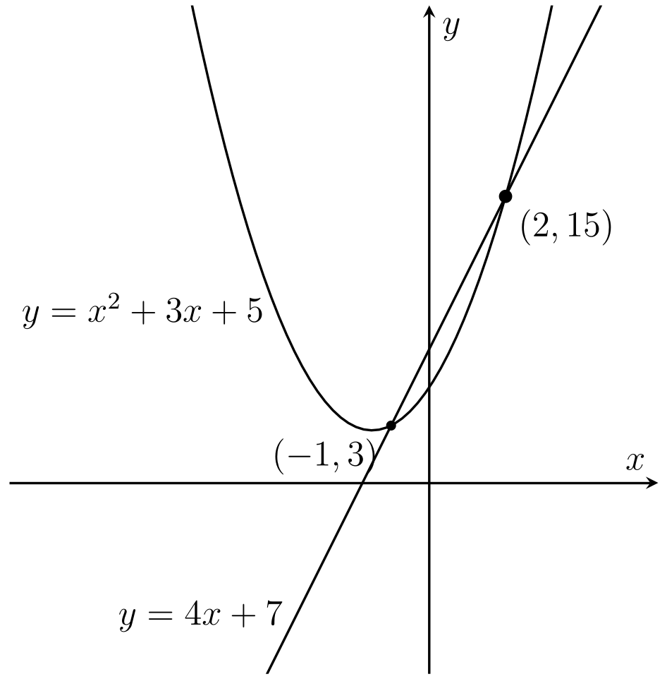 Fig. 2.15 Graph showing the intersection points of \(y =x^2+3x+5\) and \(y =4x+7\).#