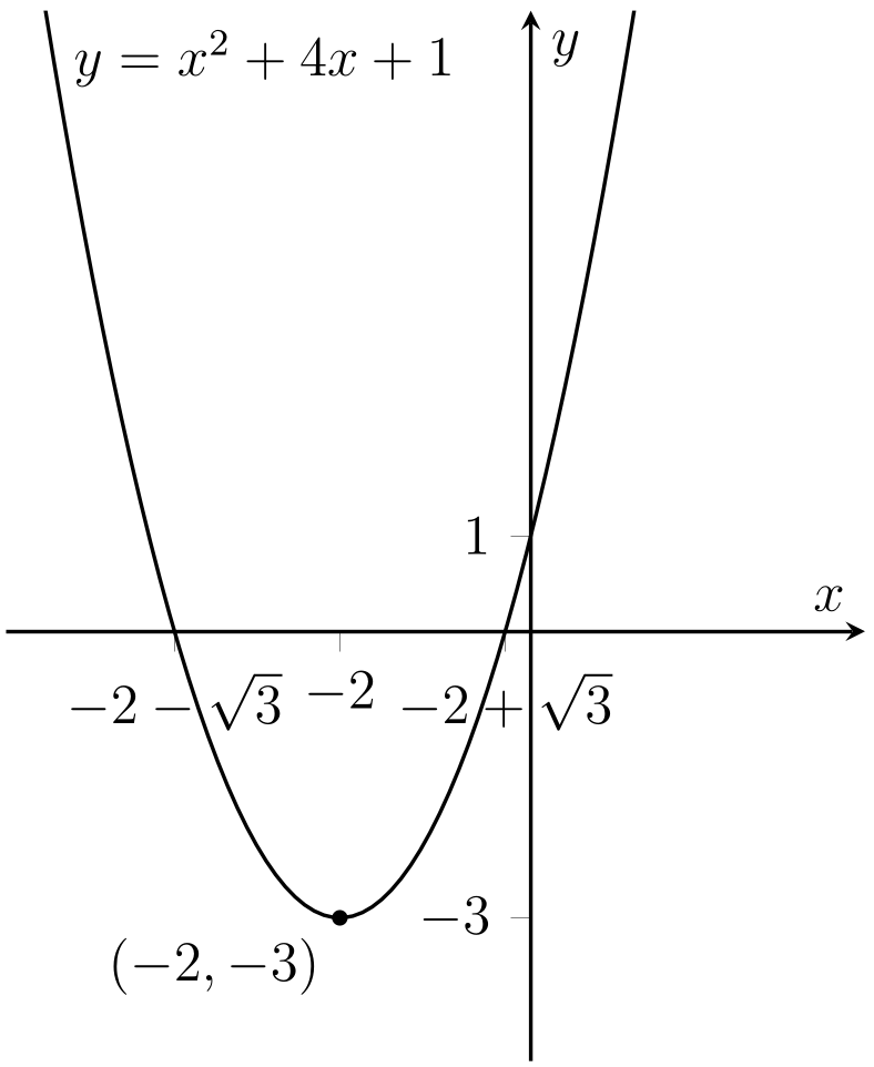 (i) Halving the coefficient of \(x\) we get \((x+3)^2=x^2+6x+9\), which is close to our original quadratic. Hence we see that \(x^2+6x + 5 = (x+3)^2 - 9 + 5 = (x+3)^2 - 4\). Here, \((x+3)^2-4\) is called the completed square form for the quadratic.