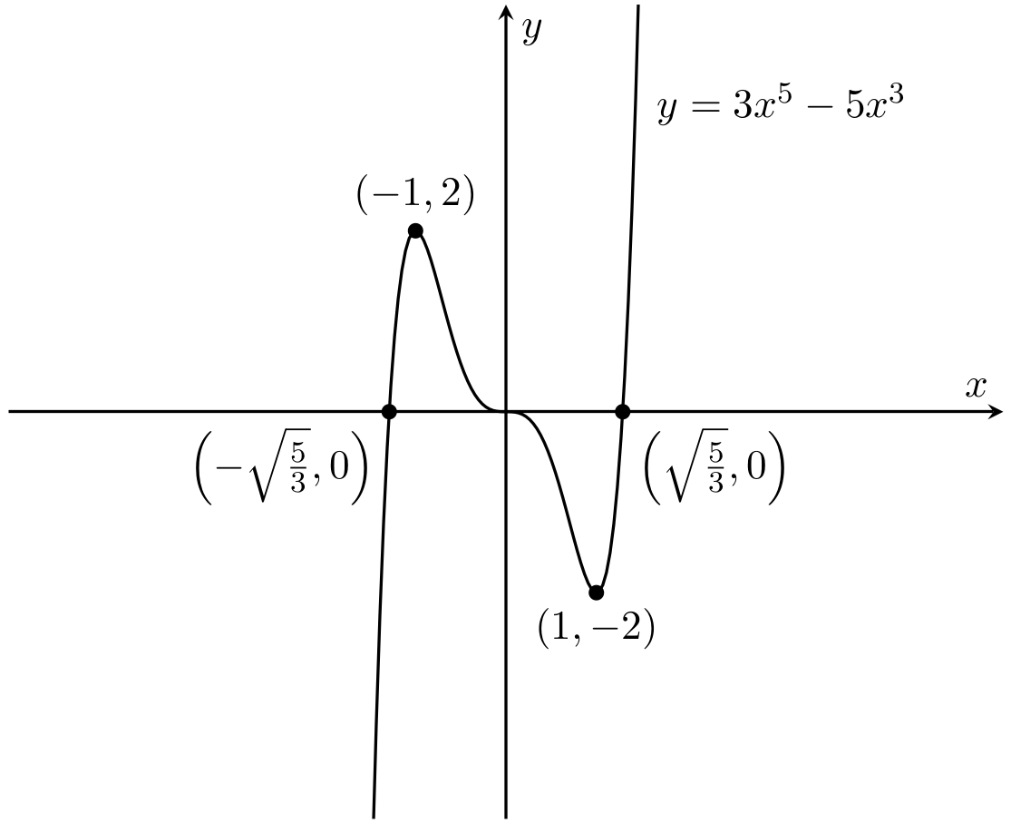 Now \(f(x) = x^3(3x^2 -5)\) so that the graph crosses the \(x\)-axis at \(x = 0\), \(x = \sqrt{\frac 53}\) and \(x = - \sqrt{\frac{5}{3}}\). As we are making a sketch, it will be helpful to get an approximate value of \(\sqrt{\frac 53} \approx 1.3\). Clearly, \(f(0) = 0\) so the graph crosses the \(y\)-axis at \(0\).Next, we find the stationary points and determine their nature. \begin{align*} \frac{dy}{dx} &= 15x^4 - 15x^2\ &= 15x^2(x^2-1)\ &= 15x^2(x-1)(x+1)\ \mbox{and}\quad\frac{d^2y}{dx^2} &= 60x^3 - 30 x\ &= 30x(2x^2-1). \end{align*} Thus the stationary points are \(P_1=(-1,2)\), \(P_2=(0,0)\) and \(P_3=(1,-2)\).