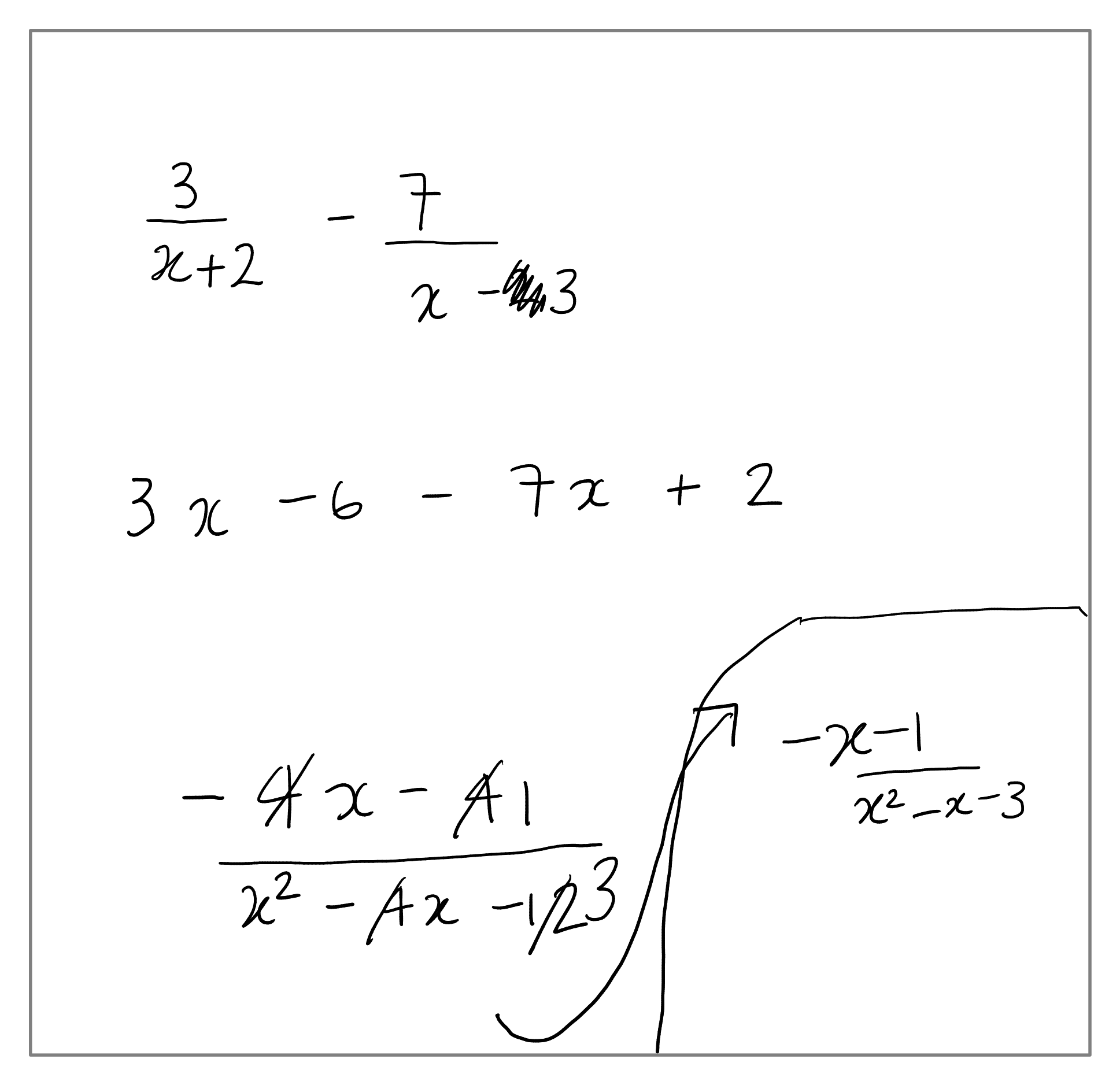 (ii) Express \(\displaystyle \frac{3}{x+2}-\frac{7}{x-3}\) as a single fraction, collecting like terms in the numerator.
