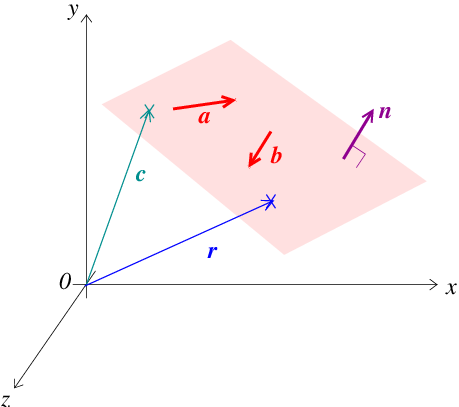 Alternatively, the equation of a plane may also be defined using the scalar and vector product. Since the cross product of two vectors is perpendicular to both vectors, the cross product between two non-parallel vectors that lie in the plane is perpendicular to the plane. A vector perpendicular to a plane is called the vector normal to the plane and often denoted, \(\vec{n}\). So for non-parallel vectors \(\vec{a}\) and \(\vec{b}\) that lie in plane the normal to the plane is given by \(\vec{n}=\vec{a} \times \vec{b}\). The scalar product of any vector that lies in the plane with the normal \(\vec{n}\) must be zero since the scalar product of perpendicular vectors is zero. The vector between any two points in the plane is parallel to the plane and therefore perpendicular to the normal vector \(\vec{n}\). Therefore the vector between some general point on the plane with position vector \(\vec{r}\) and the point on the plane with position vector \(\vec{c}\) must lie in the plane. This vector can be written as \((\vec{r} - \vec{c})\) and since it lies in the plane it must be perpendicular to the normal vector \(\vec{n}\). Therefore the scalar product between \((\vec{r} - \vec{c})\) and \(\vec{n}\) must be zero i.e.,