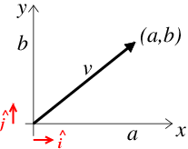 Fig. 12.1 The vector \(\vec{v}=(\:a\:\:\:b\:)\) is plotted as a large black arrow on a graph of 2D Cartesian space with axes x and y. The basis vectors are indicated as small red arrows.#