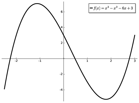 Fig. 4.1 Visualising the function \(f(x)=x^{3}-x^{2}-6x+3\) we can see that there is an obvious maximum and minimum. The change in concavity of the curve is also apparent indicating an inflection point between 0 and 1;#