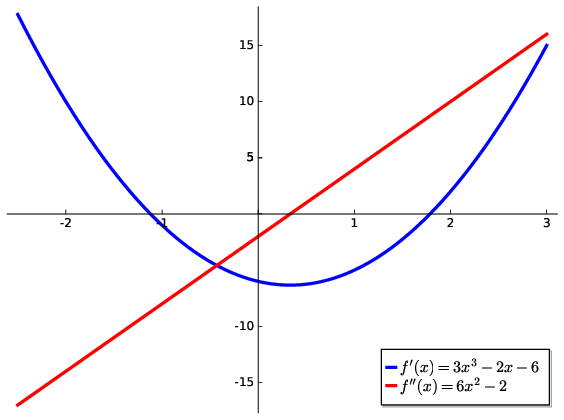 Fig. 4.2 These critical points can be determined analytically via the higher derivatives of \(f(x)\). Here the first derivative goes to zero at the max/min points and the second derivative changes sign at the inflection point.#
