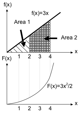 The diagram below shows the function \(f\left(x\right)=3x\) and how the integral \(F\left(x\right)\) gives the area under the function.