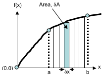 If we take a general function \(f\left(x\right)\) as shown in Fig. 7.1, the area below the curve between limits \(a\) and \(b\) has been divided up into \(N\) slices each with width \(\delta x\) and approximate height \(f\left(x\right)\) - note that this is an approximation but becomes more precise as \(\delta x\) becomes very small.