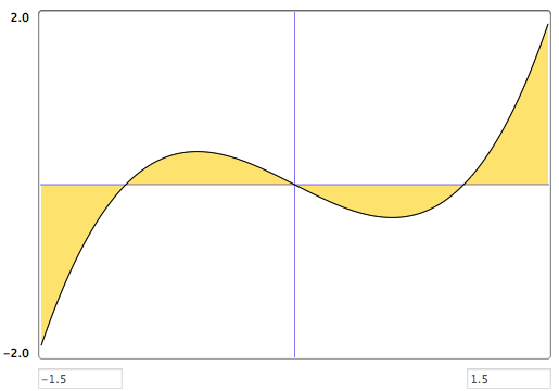 Fig. 7.3 The odd function \(f\left(x\right)=x^{3}-x\). Yellow regions are the areas under the curve between symmetric limits.#