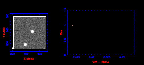 Let us call the number of counts detected from an object \(N_c\). This number is proportional to the number of photons arriving from the star. Thanks to the filter, all the photons detected are of similar wavelength and hence energy, the number of counts is proportional to the energy arriving from the objects, i.e \(N_c \propto \Delta E\). Calculating the constant of proportionality is essential for measuring properly calibrated photometry - we will look at this in a later lecture. However, suppose we are only interested in producing the light curve in figure 34. In this case we are interested in relative changes in the flux, as a function of time and we can proceed without knowing the constant of proportionality. The first step in photometry is thus to calculate the number of counts from an object in an image
