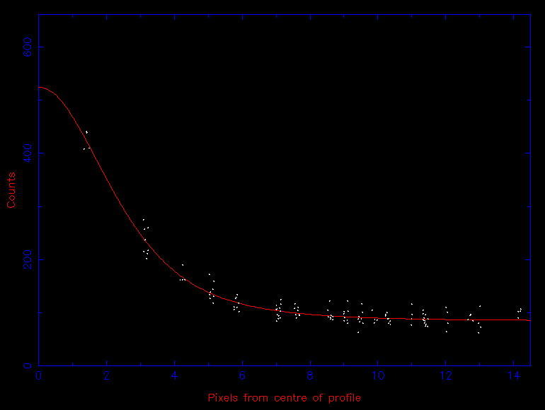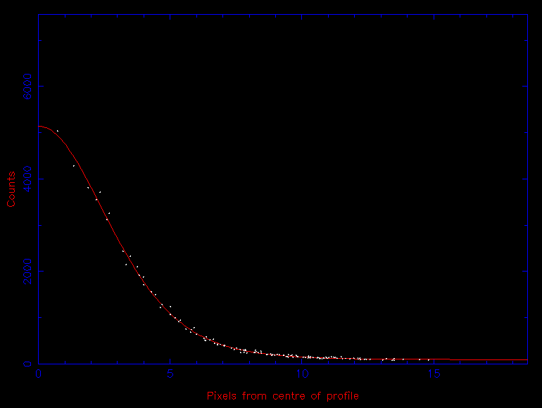 The first step - accurately determining the centre of the star in the image (or centroiding) - is usually achieved by adding up the light from the star along the rows and then the columns of the CCD, giving a one-dimensional stellar profile in the x direction and another in the y direction. The resulting profiles, which are known as Point Spread Functions or PSFs are then fit with a one-dimensional Gaussian (or similar) function, akin to those shown in figure 38. The position of the centre of the Gaussian fit is then used as an estimate of the centre of the star, which can change as a function of time due to guiding and seeing variations. This technique can fail in crowded fields, or if the stellar PSF is very faint or highly non-Gaussian; a number of more complex centroiding techniques exist for such cases.