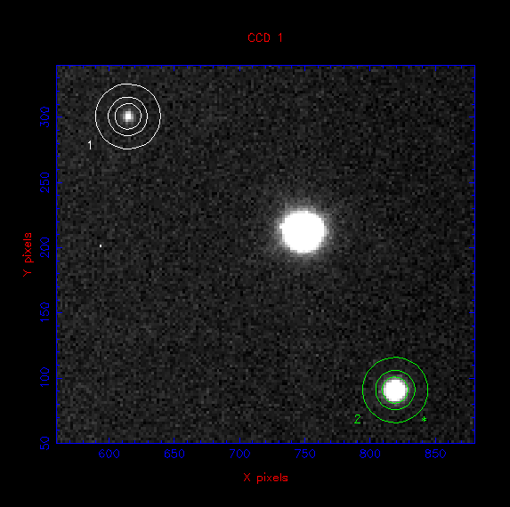 Figure 39: aperture photometry from a CCD image. The target is labelled as aperture 1. The non-variable comparison star is labelled as aperture 2 (in green). The unmarked bright star is saturated and hence unusable. The inner circle defines the total signal from the target. The annulus defined by the two outer circles is used to calculate the signal from the sky. Credit: Vik Dhillon
