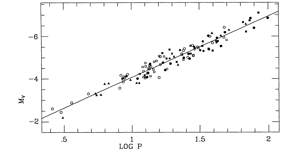 Fig. 10 Calibration of the Cepheid period-luminosity relationship from Lane & Stobie (1994). Here, the logarithm of the period (in days) is shown against the absolute magnitude. The distance to any Cepheid can be found by measuring its period and using this relationship to infer its absolute magnitude. This is compared to the measured apparent magnitude to yield a distance modulus, and hence a distance.#