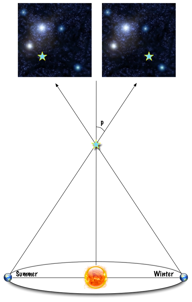 Parallax is the name given to the phenomenon where an object appears to move, relative to the background, when viewed along two different lines of sight. Parallax is easily experienced by holding your thumb up at arms length and then closing one eye, and then the other. Your thumb appears to move relative to the background. The effects of parallax mean that each eye sees a subtly different scene; having two eyes with overlapping fields of view is what allows your brain to measure the distances to everyday objects and gives you depth perception. Therefore, you are already an expert in applying parallax to measure distance, and what follows will surely be simple revision.