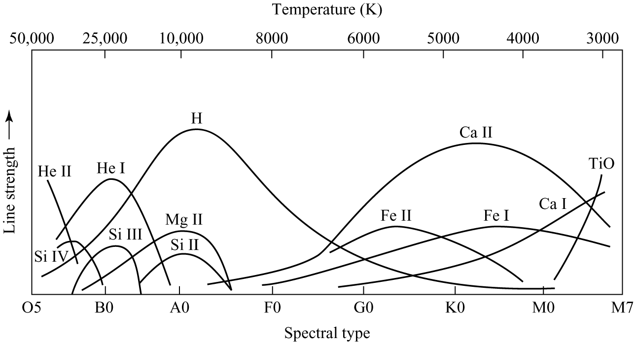 The details of how line strengths vary across the Harvard spectral classification sequence is shown in figure 36. By measuring the relative line strengths in the spectrum of any star it is a simple matter to assign it to a spectral class in the Harvard sequence.