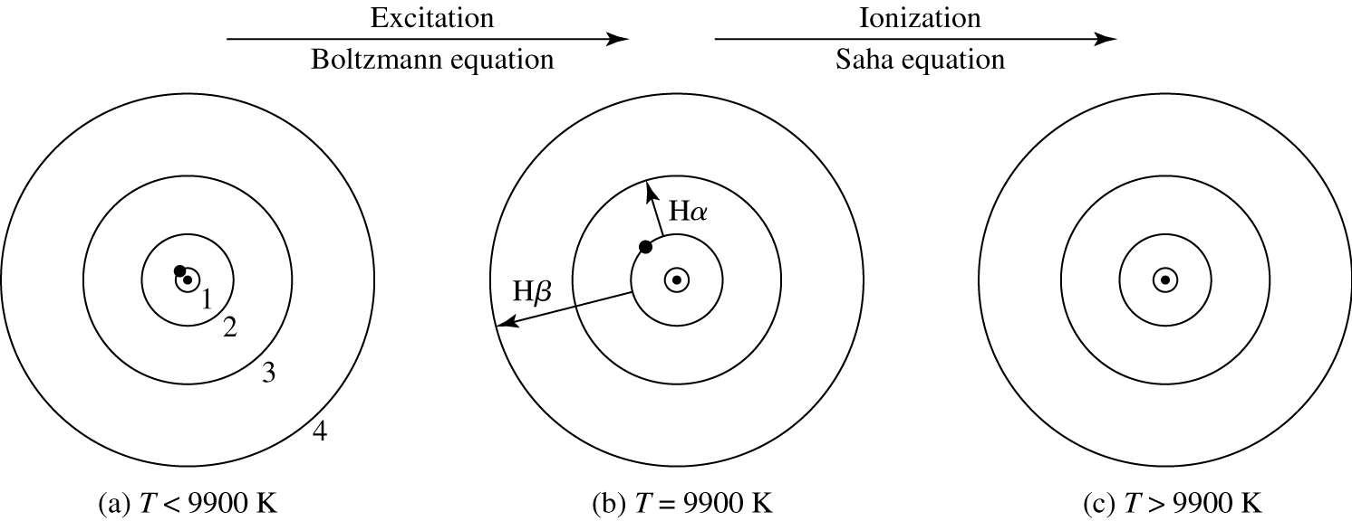 Fig. 44 The electron’s position in the hydrogen atom at different temperatures. In (a), the electron is in the ground state. Balmer absorption lines can only be produced when the electron is excited to the \(n=2\) level, as shown in (b). In (c) the atom has been ionised, and no longer produces absorption lines.#