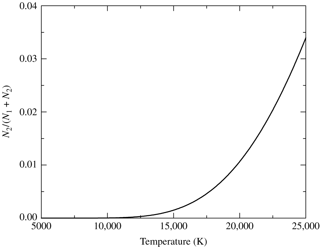 Fig. 43 The number of electrons in \(n=2\) (\(N_2\)) divided by the total number of electrons \(N_1 + N_2\) for hydrogen gas, as determined by the Boltzmann equation.#