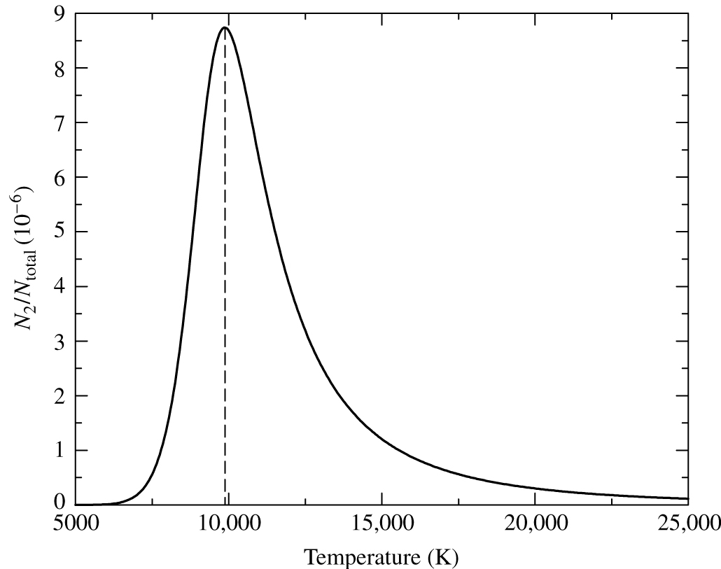 Fig. 45 The number of electrons in the \(n=2\) level of hydrogen, divided by the total number of hydrogen atoms. This calculation takes account of electron excitation (the Boltzmann equation) and ionisation (the Saha equation). The peak occurs at approximately 9900 K, in good agreement with the temperature of early-A stars, where the Balmer line strength peaks.#