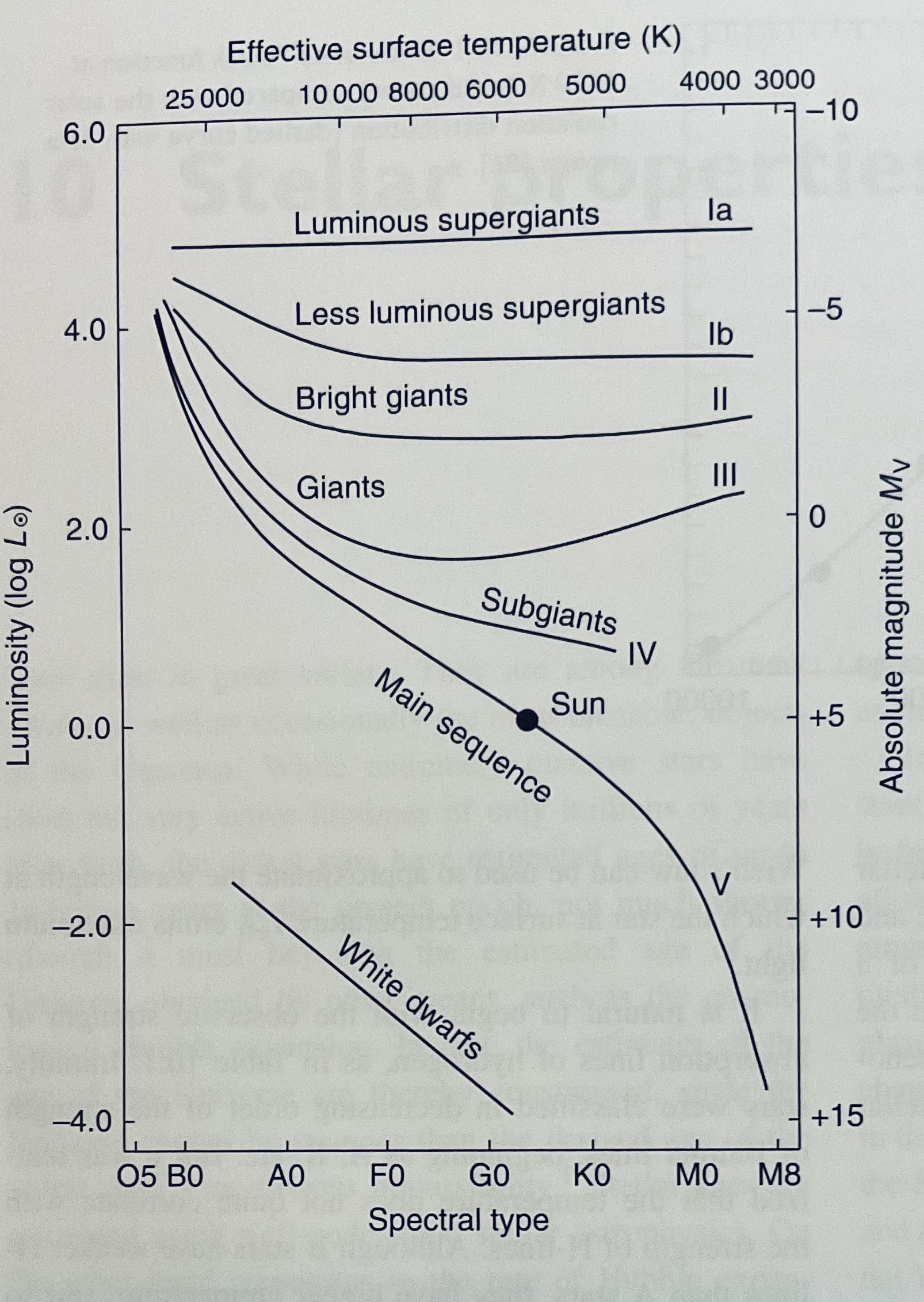 Fig. 46 Hertzsprung-Russell diagram highlighting different luminosity classes, spanning supergiants (I), giants (III), dwarfs (V, main sequence) plus white dwarfs. Figure is from Pradhan & Nahar (2011, CUP).#