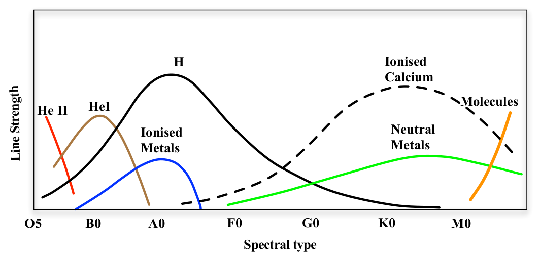 Finally, we are in a position to understand the Harvard spectral sequence as a sequence in temperature. The line strengths of species vary along the sequence due to the interplay of electron excitation and ionisation.