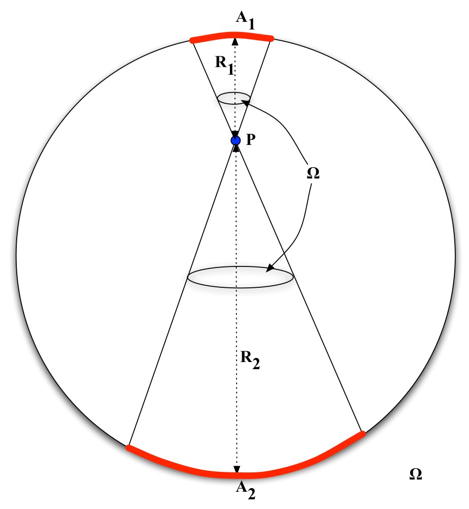 This turns out to be OK to derive. We imagine the shell to be thin, with a density of ρ kg per unit surface area. We pick a point, \(P\) inside the shell and draw two cones of the same solid angle radiating out from the point \(P\), so that they includes two small areas of the shell on opposite sides: these two areas will exert gravitational attraction on a mass at \(P\) in opposite directions. We will show that these forces exactly cancel out. The situation is shown in figure 53.
