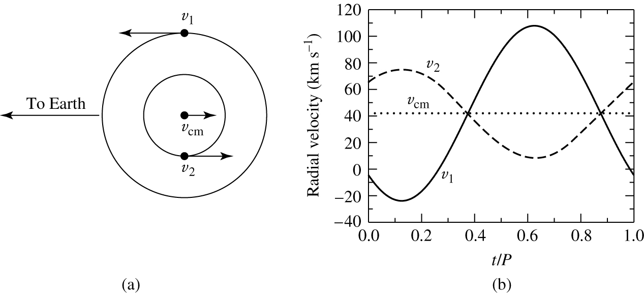 Fig. 62 The orbital paths and radial velocities of two stars in circular orbits. In this example, \(M_1 = 1\) M\(_{\odot}\), \(M_2 = 2\) M\(_{\odot}\) and the orbital period is \(P=30\) d. The whole binary is moving away from us with a radial velocity of \(v_{cm} = 42\) km s-1. \(v_1\) and \(v_2\) are the velocities of star 1 and star 2 respectively. (a) The plane of the circular orbits lies along the line of sight of the observer. (b) The observed radial velocity curves.#