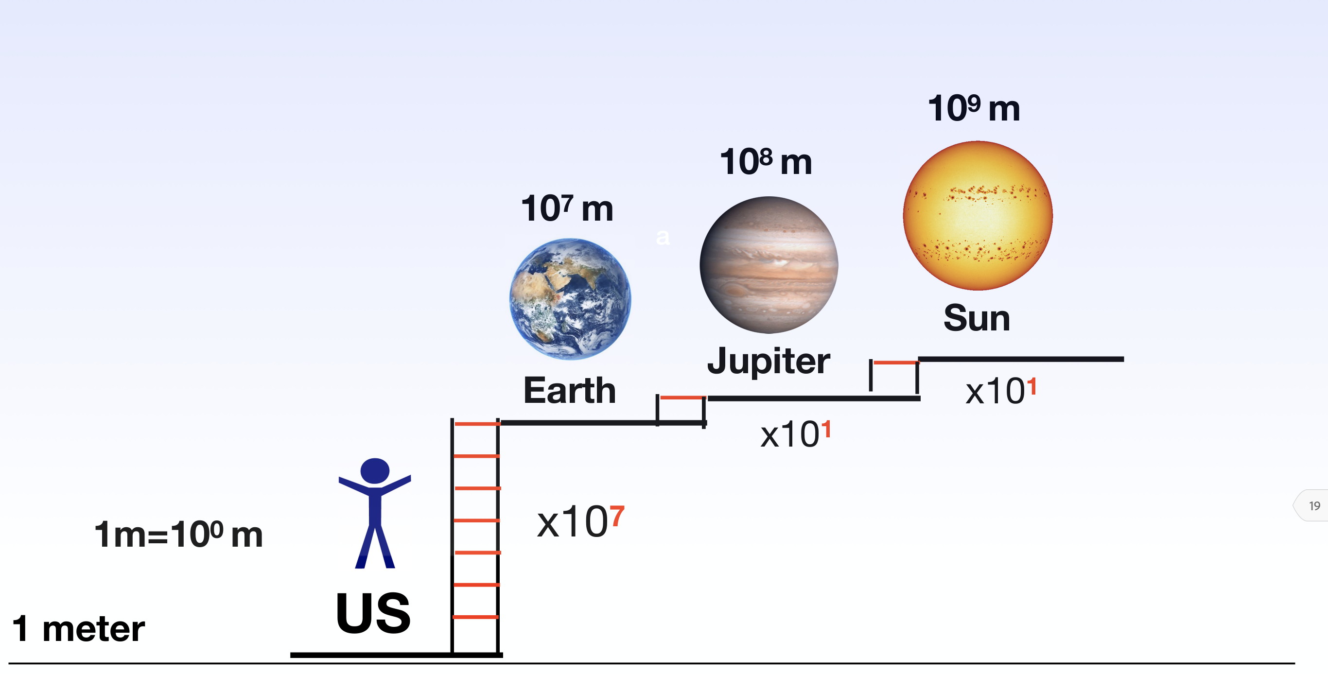 Fig. 71 Reminder of the size of terrestrial planets such as the Earth, versus gas giants (Jupiter) and main sequence stars, such as the Sun. Courtesy Stan Owocki (Bartol).#