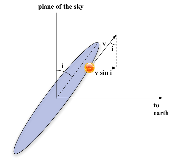 As with the visual binaries before, the angle of inclination between the line of sight and the orbit effects the observed radial velocities. Figure 63 shows that if the star has a velocity \(v\) around its orbit, what we actually observe is \(v^{\prime} = v \sin i\), where \(i\) is the inclination angle of the orbit. To obtain the actual velocities of the stars it is thus necessary to determine the orbital inclination somehow.