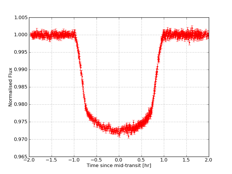 Now, we calculate the transit depth, as a fraction of the total out-of-transit light